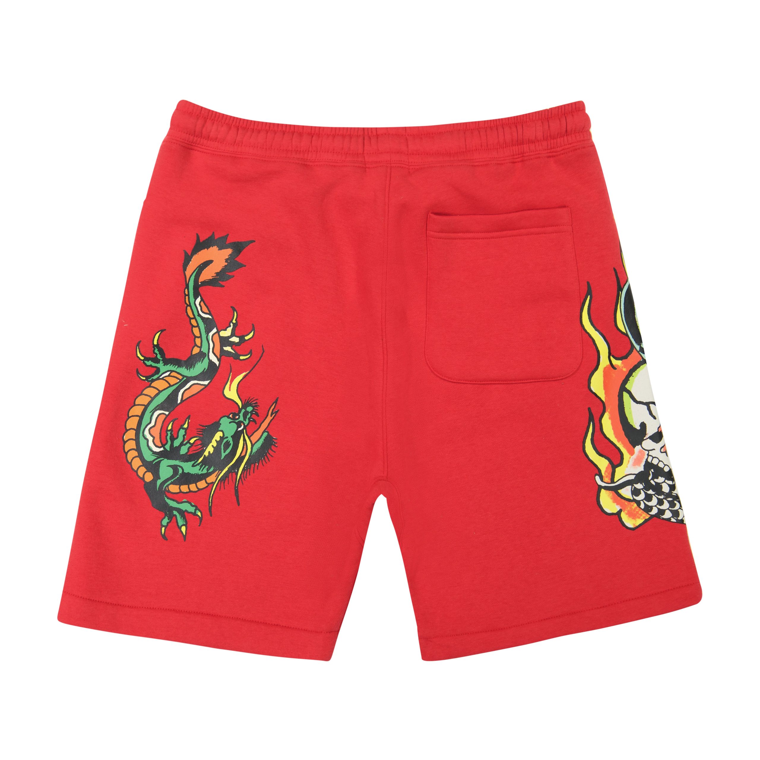 Ultra soft cotton blend fleece shorts featuring an adjustable drawstring. Complete with layered archival Ed Hardy graphics and a white logo.