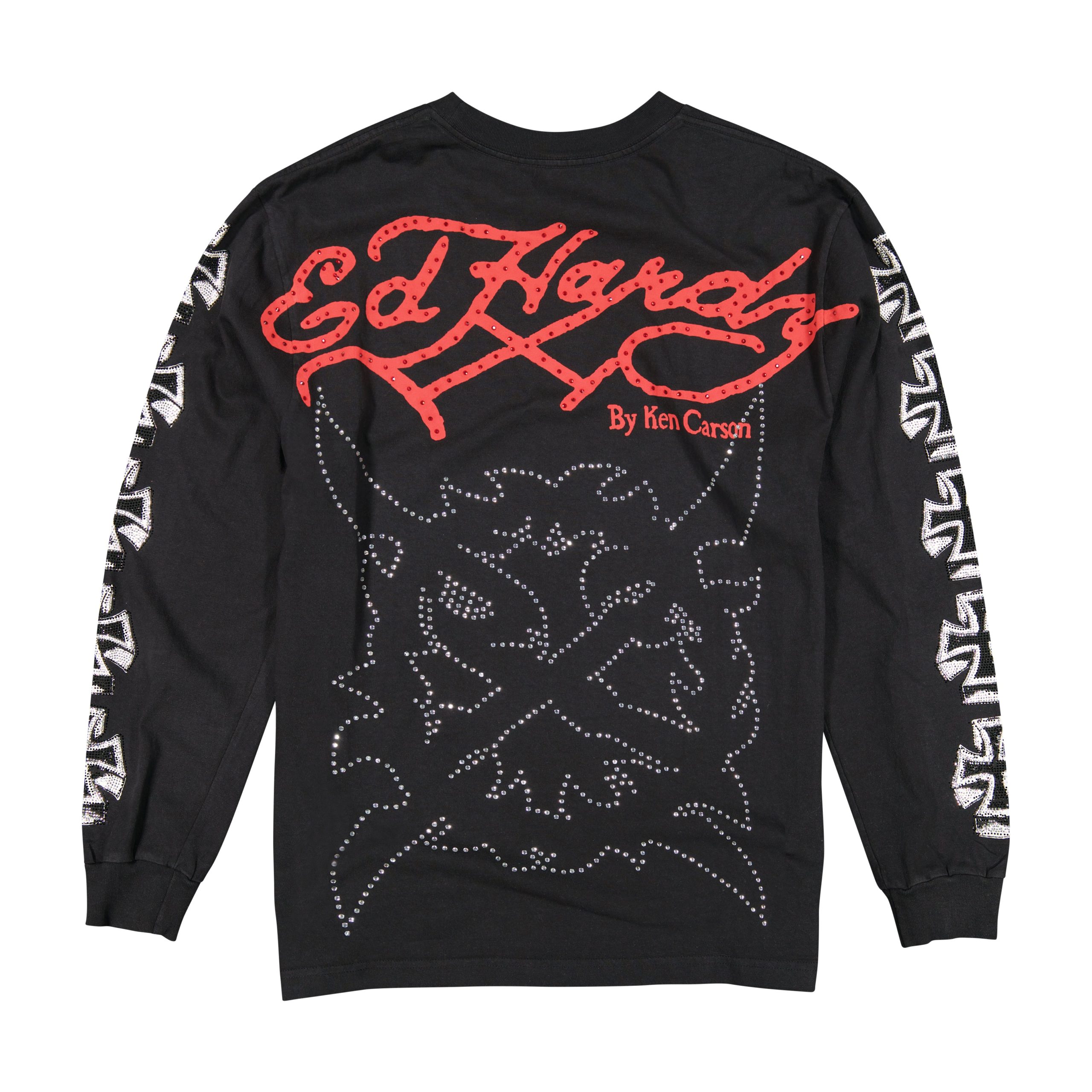 This heavyweight long sleeve rhinestone tee features a signature Ed Hardy by Ken Carson logo and Chaos graphics. This product fits true to size. for an oversized look it we recommend sizing up.
