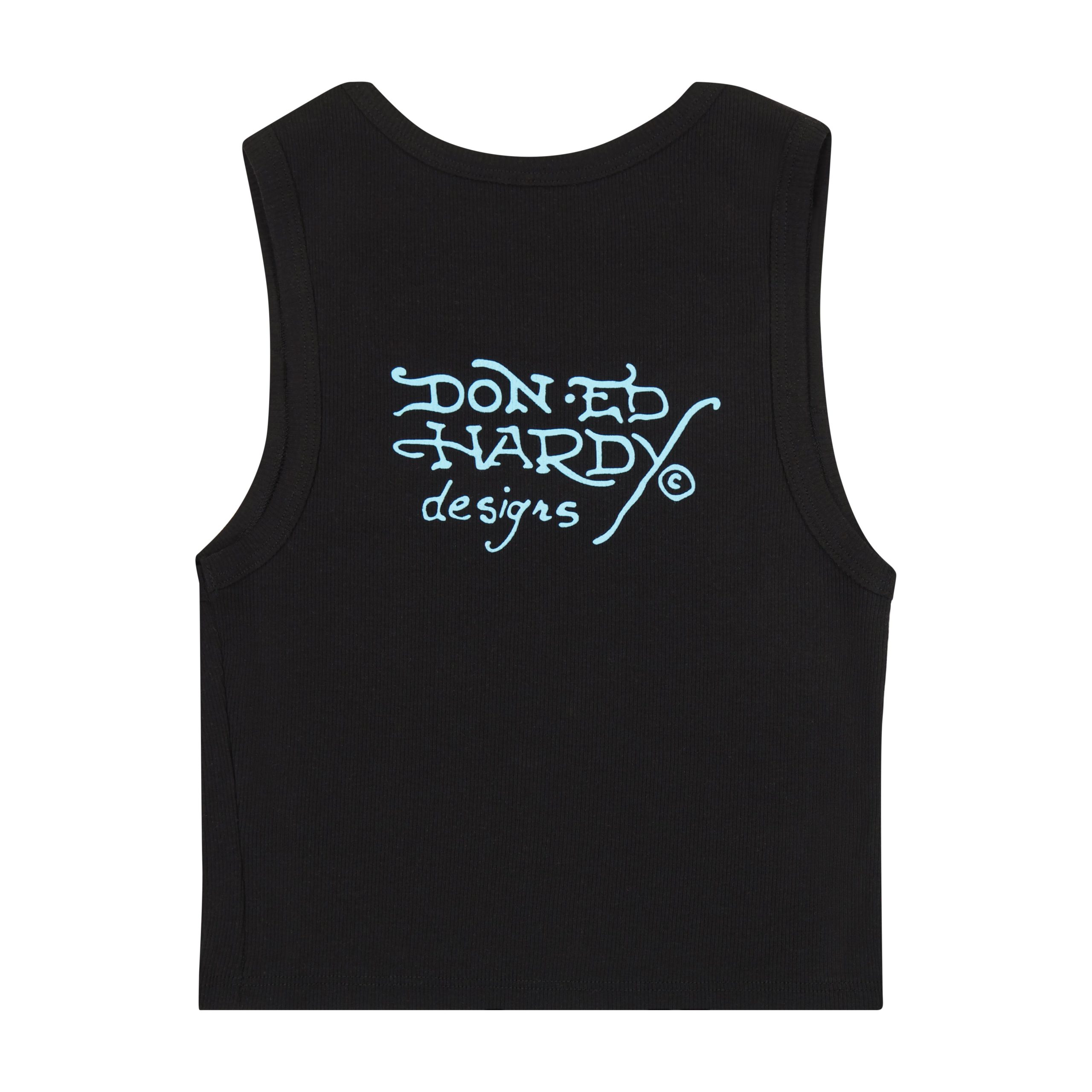 Cropped ribbed tank top constructed from 100% cotton. Features a cross heart graphic and an Ed Hardy by Kim Petras logo.