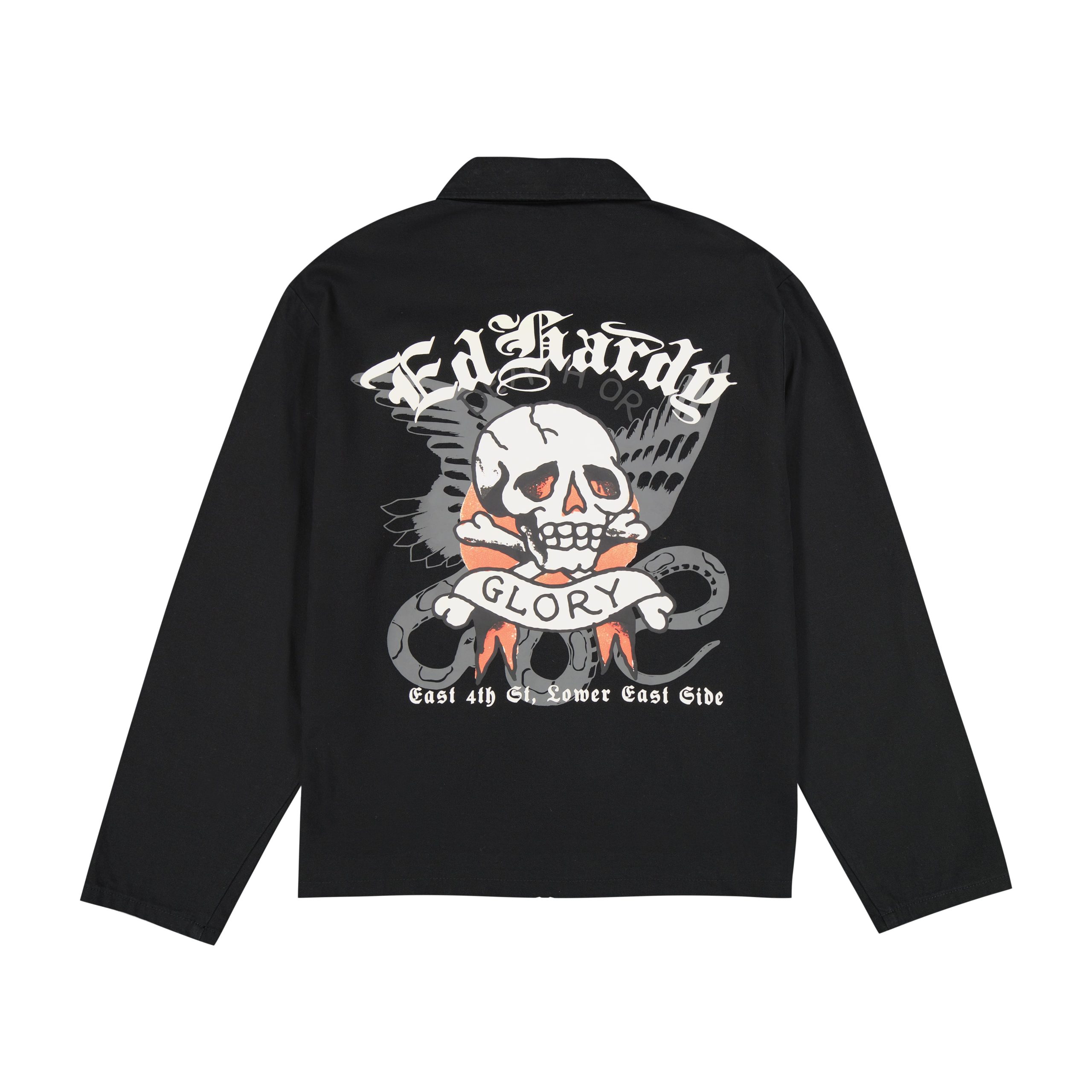 This workwear jacket puts an iconic Ed Hardy twist on a vintage-inspired outerwear silhouette. Cut from 100 percent cotton canvas with a fully lined interior. Features a heavy duty zipper. and complete with archival Ed Hardy artwork and logos.