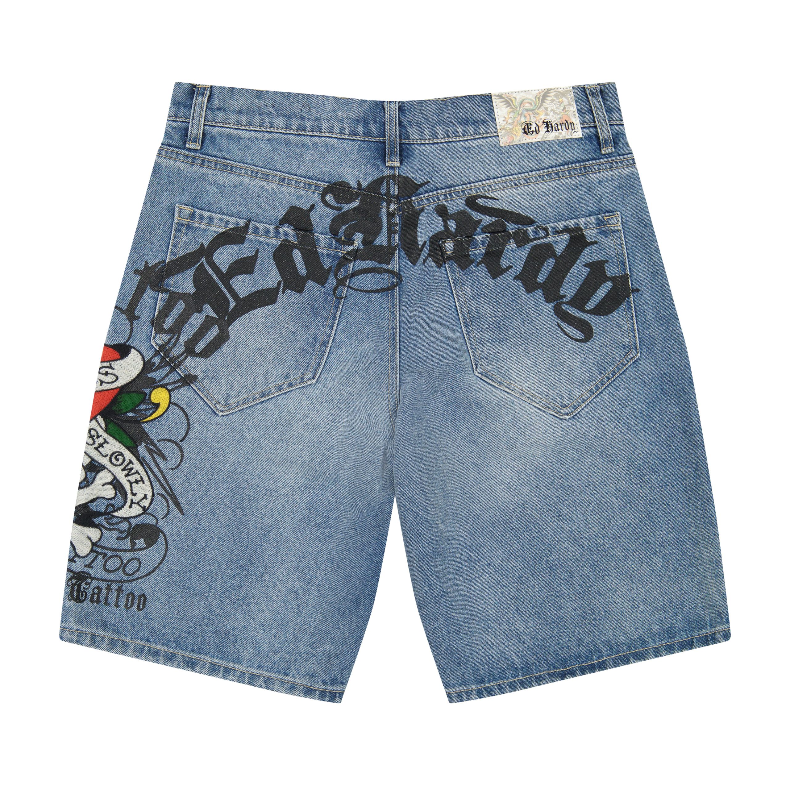 These light wash skater shorts are vintage inspired and feature several archival Ed Hardy graphics and logos.