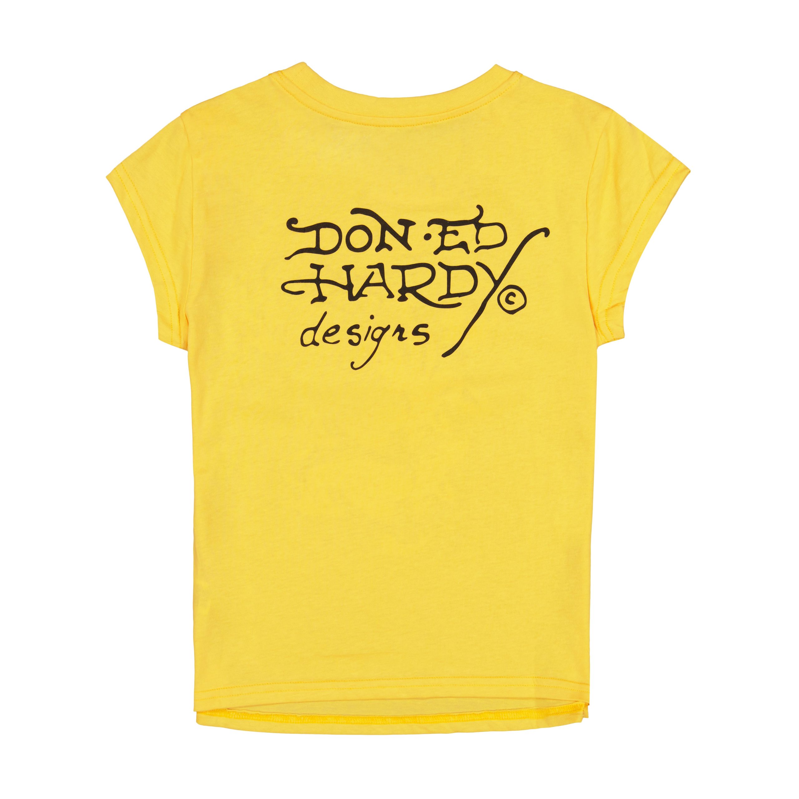Cap sleeve fitted tee cropped at the waist and cut from a cotton poly blend in Peach. Complete with archival logos and layered Ed Hardy graphics.